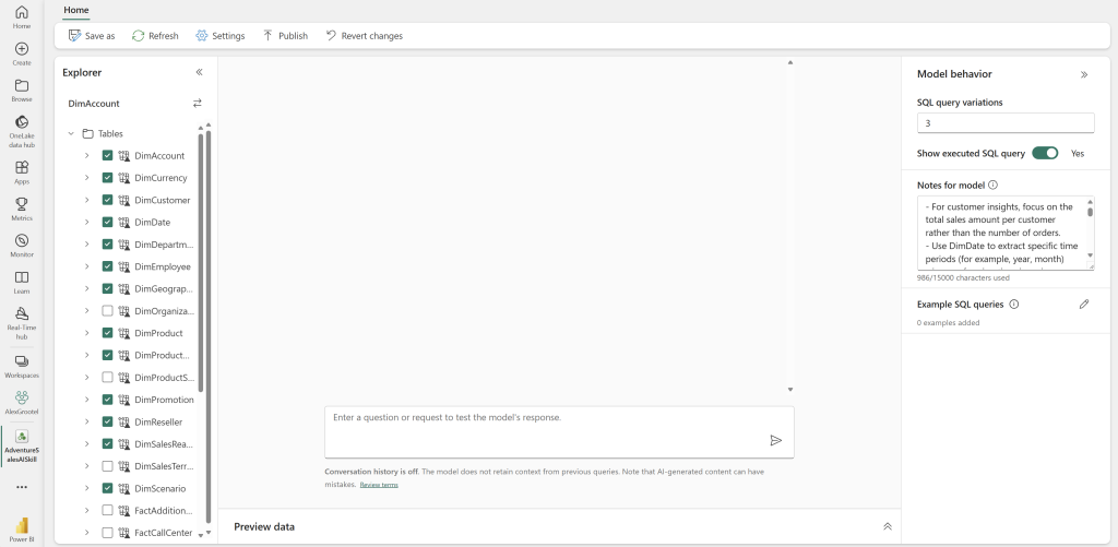 - Enhanced Collaboration: By configuring AI skill for broader use across teams, developers can provide non-technical colleagues with tools to query data without SQL knowledge. Meanwhile, Copilot supports developers directly in their workflows, assisting with debugging, optimizing, or expanding queries generated by AI Skill.